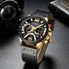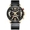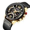 Ανδρικό αδιάβροχο ρολόι Curren με μαύρο δερμάτινο λουράκι, μεταλλική χρυσή κάσα με μαύρο στεφάνι και μαύρο καντράν με χρυσές λεπτομέρειες, χρονογράφους και ένδειξη ημερομηνίας