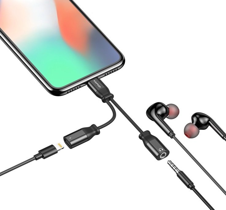 Αντάπτορας που συνδέει έναν αρσενικό ακροδέκτη Lightning με μια θηλυκή θύρα 3.5mm και μια Lightning.