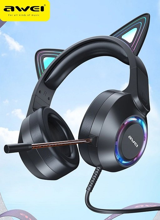 Ενσύρματο ακουστικά AWEI με εξαιρετικό ήχο και πανέμορφο σχεδιασμό με αυτάκια γάτας που φωτίζουν με πολύχρωμο φωτισμό LED. Mε ενσωματωμένο ρυθμιζόμενο μικρόφωνο και ρυθμιζόμενο στεφάνι κεφαλής για άνετη χρήση. Διαθέτουν τεχνολογία μείωσης θορύβων και εργονομικά μαξιλαράκια που προσφέρουν άνεση και απόλυτη ηχομόνωση.