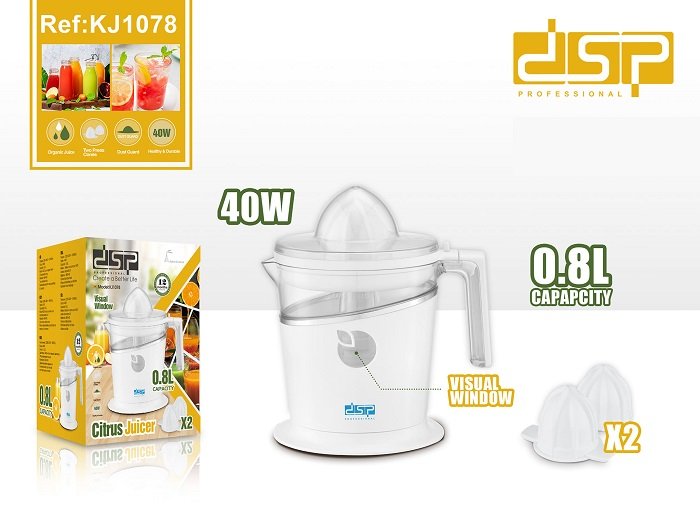 Ηλεκτρικός στίφτης της DSP, υψηλής απόδοσης, πρακτικός και εύχρηστος για να έχετε καθημερινά γρήγορα και χωρίς κόπο τον αγαπημένο σας χυμό πορτοκαλιού, λεμονιού κα. Διαθέτει δοχείο και 2 κώνους στυψίματος διαφορετικού μεγέθους για μικρότερα και μεγαλύτερα φρούτα.
