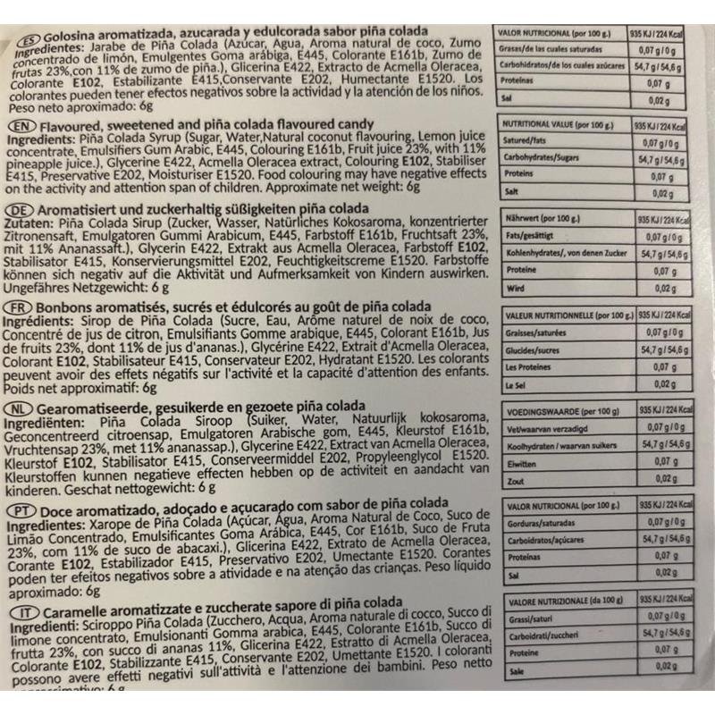- Ingredients: Pina Colada Syrup (Sugar, Water, Natural Coconut Flavor, Lemon Juice Concentrate, Emulsifiers, Gum Arabic, E445. Colorings E161b, Fruit Juice 23%, with 11% Pineapple Juice). Glycerin E422, Acmella Oleracea Extract, Colorings E102, Stabilizer E415, Preservative E202, Humectant E1520. Colorings may have an adverse effect on children’s activity. Approximate weight: 6 g.