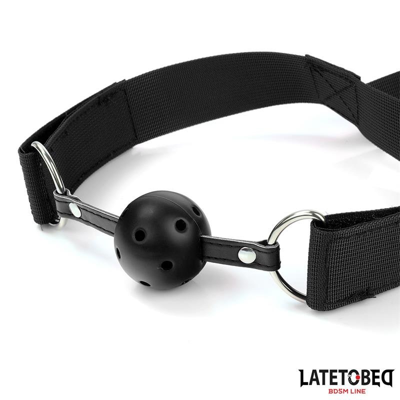 Complete restraints. It has three parts: a gag with a semi-collar on the top, adjustable handcuffs placed on the back on the other end, and a butt hook on the bottom. Keep your submissive always in line with these restraints. You can remove the hook and ball of the gag whenever you want; they are completely removable.