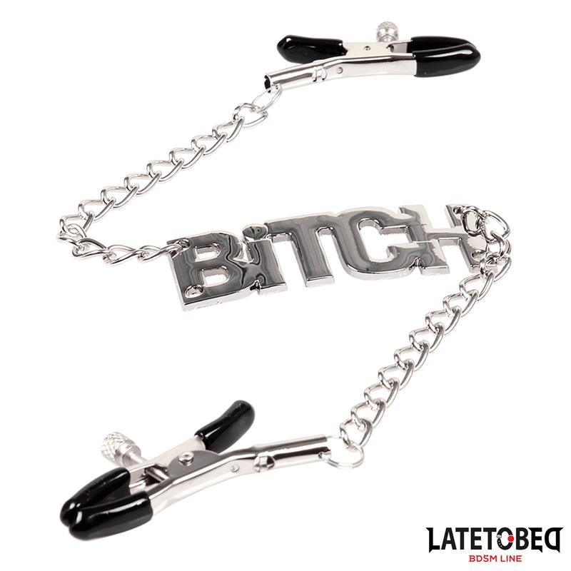 Nipple clamps for the most daring. These classic, adjustable clamps feature a chain and the word BITCH in bold.