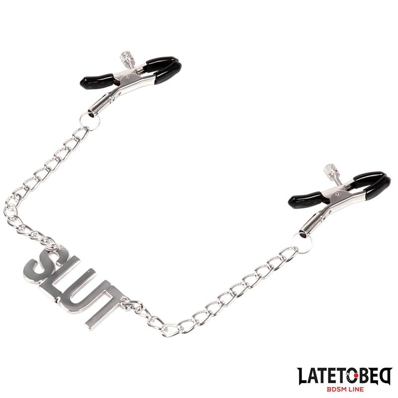 Nipple clamps for the most daring. These classic, adjustable clamps feature a chain and the word SLUT in bold.