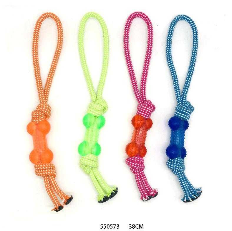 Παιχνίδι σκύλου κόκκαλο μασητικό από ανθεκτικό, ελαστικό, μη τοξικό TPR, με σχοινί με κόμπους και λαβή, συνολικού μήκους 38cm. Φροντίζει την υγεία τον δοντιών του σκύλου σας διατηρώντας τα καθαρά και μειώνοντας την πέτρα, ενώ παράλληλα διασκεδάζει παίζοντας.
