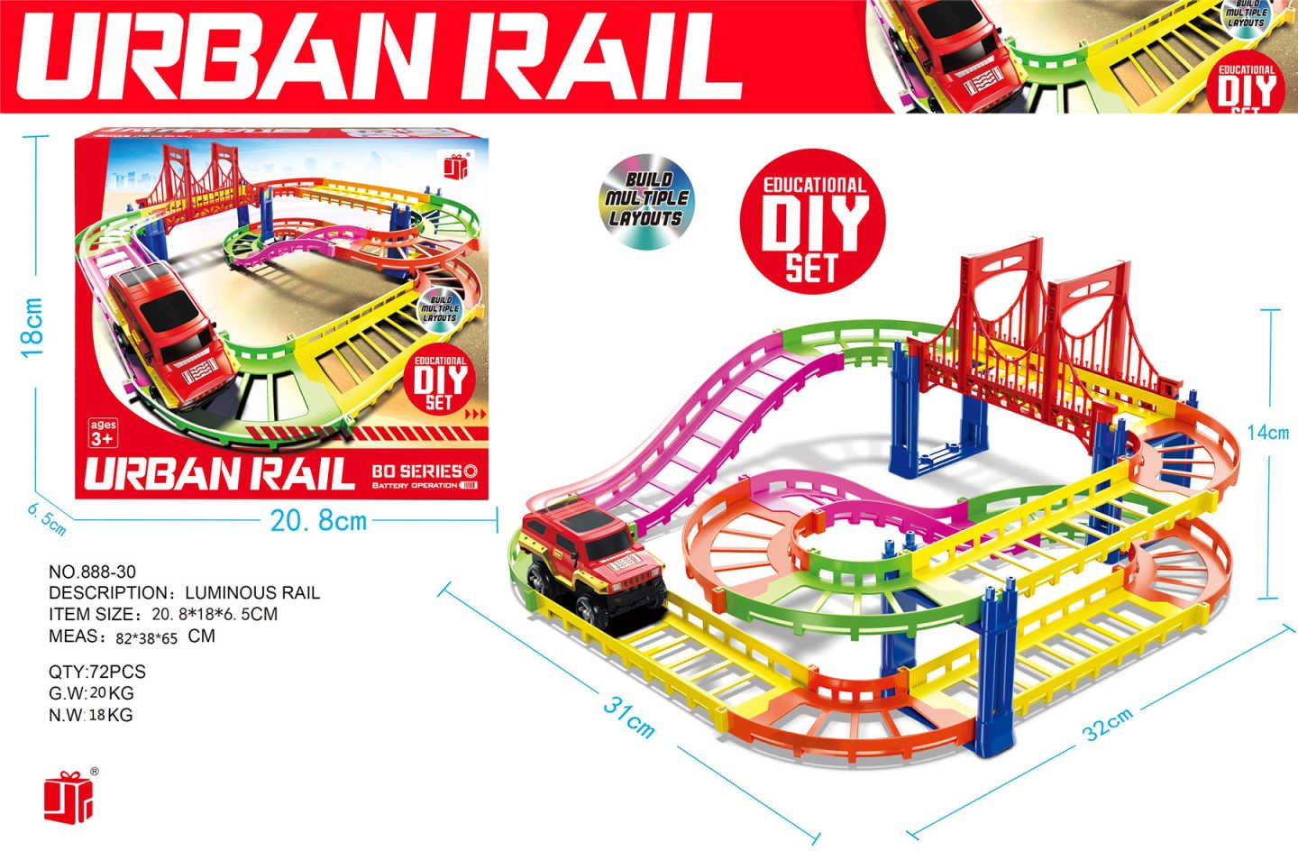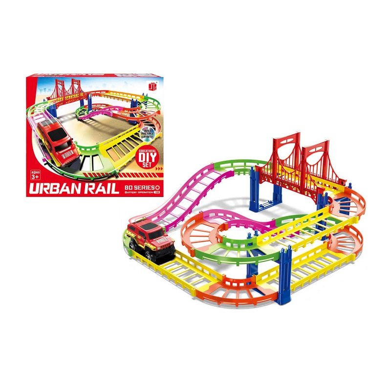 Διαθέτει πολύχρωμες ράγες με γέφυρα και όχημα-τζιπ.