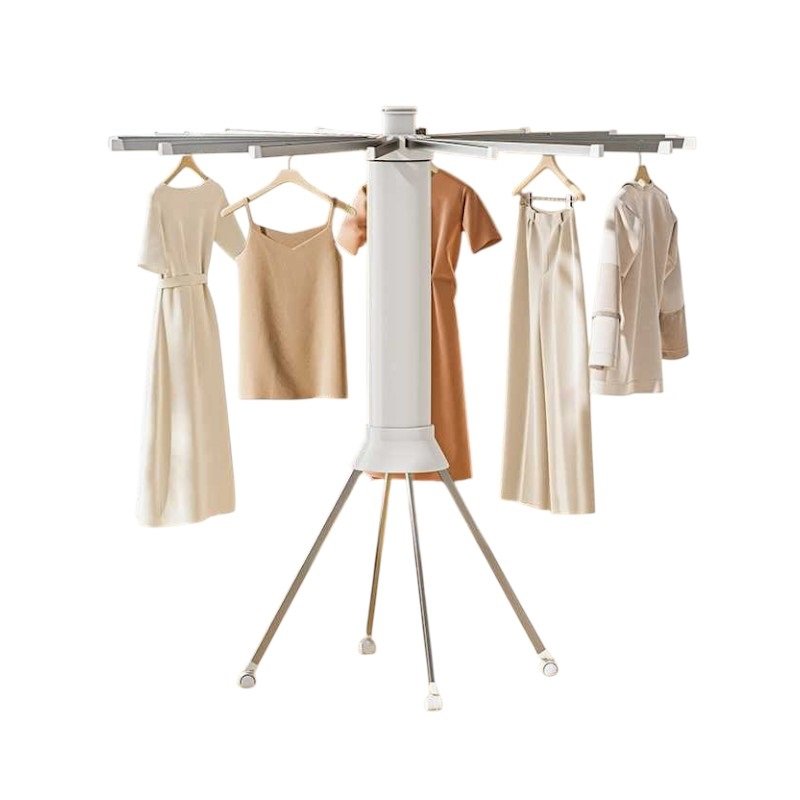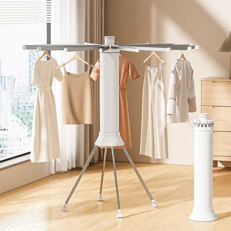 Πτυσσόμενη κρεμάστρα δαπέδου και απλώστρα ρούχων πολλαπλών χρήσεων, με μεταλλικό σκελετό, ροδάκια μετακίνησης και εργονομικό σχεδιασμό που αναδιπλώνεται για εξαιρετικά εύκολη αποθήκευση και μεταφορά χωρίς να καταλαμβάνει χώρο.
