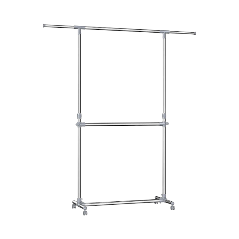 Τροχήλατη κρεμάστρα δαπέδου διπλή πολλαπλών χρήσεων, ιδανική ως έπιπλο εισόδου ή ως απλώστρα ρούχων. Μεταλλικός σκελετός. Ρυθμιζόμενο ύψος και μήκος βέργας. Διαστάσεις: 100-165 x 48 x 115-180 cm.