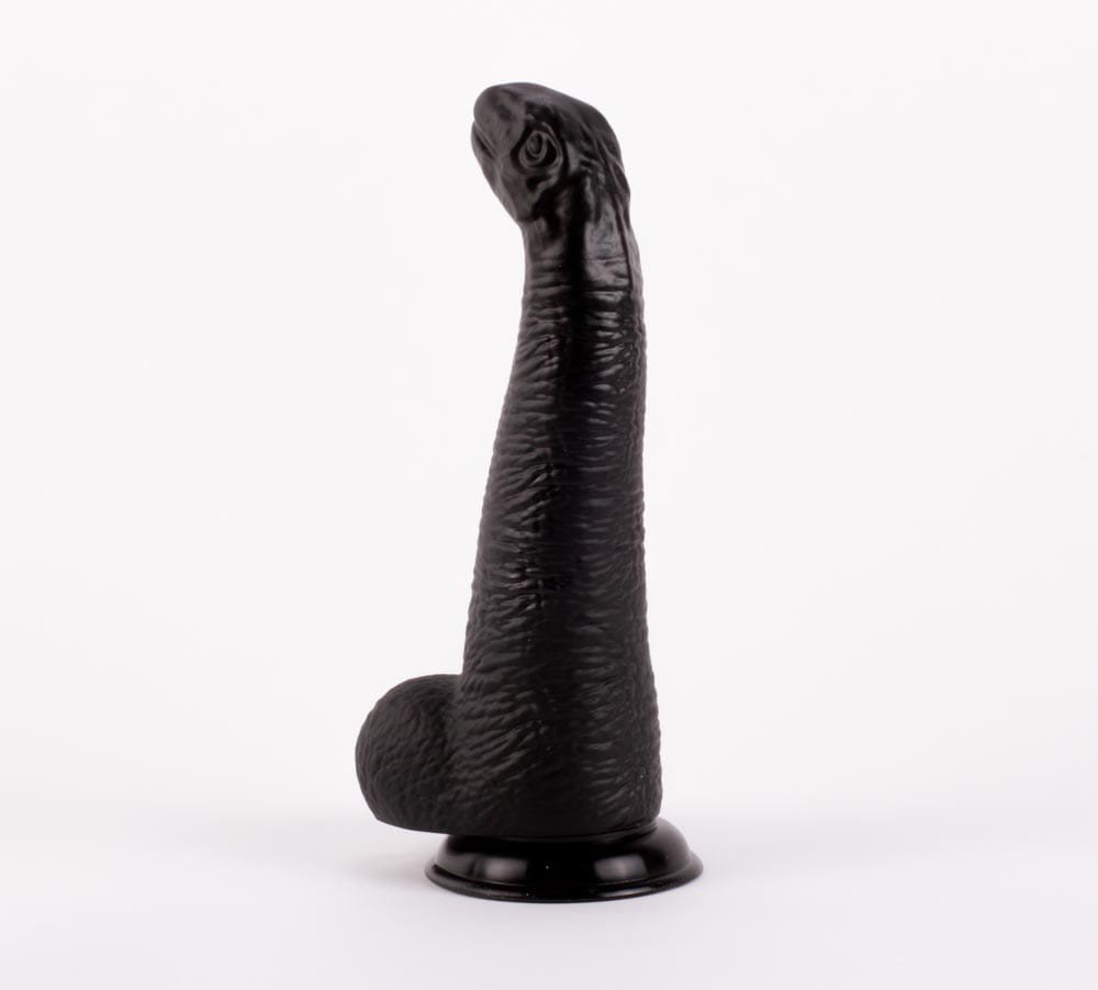 Made of high quality material with a skin-like feel similar to body tissue, this unique dinosaur-shaped bendable dildo is motorless, with a stimulating surface and testicles. Its suction cup can be attached to a flat surface.
